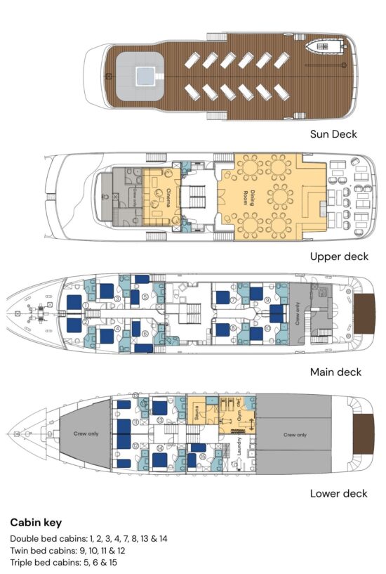 | Standard Cabin, Lower Deck | Standard Cabin, Main Deck | Standard Cabin, Lower Deck | Standard Cabin, Main Deck | Standard Cabin, Lower Deck | ||